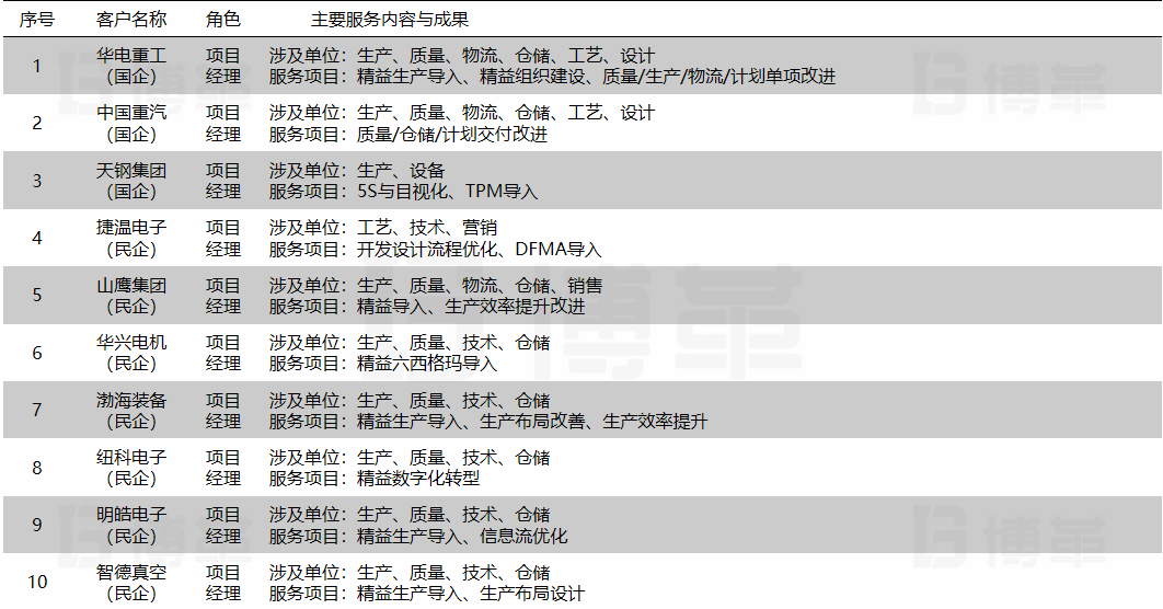 主講課程:精益生產方法工具課程(包含TPM,快速換型,價值流分析,5S與目視化等);六西格瑪DMAIC、DMEDI 綠帶課程,質量工具(APQP,FMEA,控制計劃,SPC等),質量提升三部曲、PMC