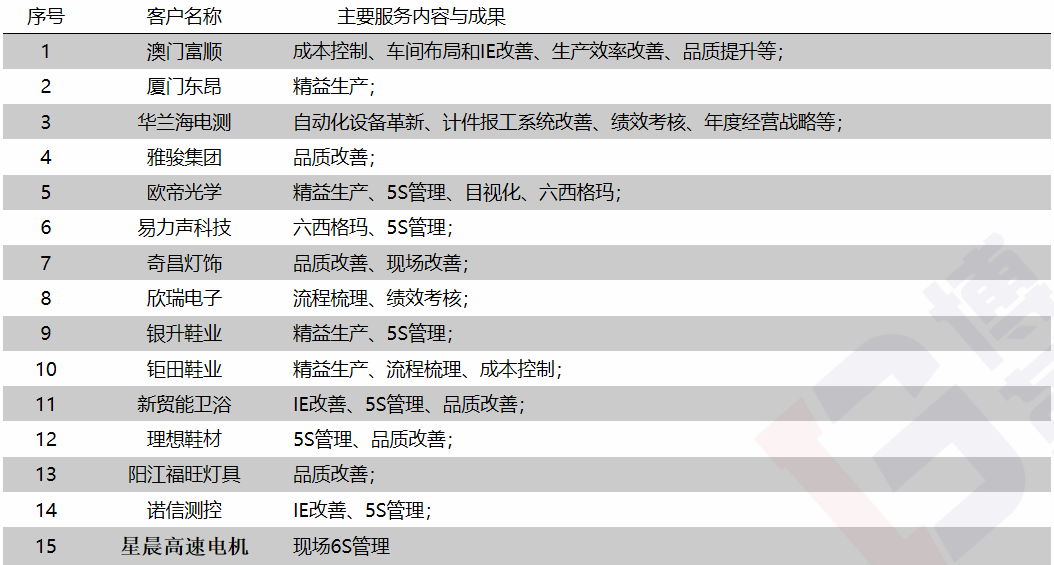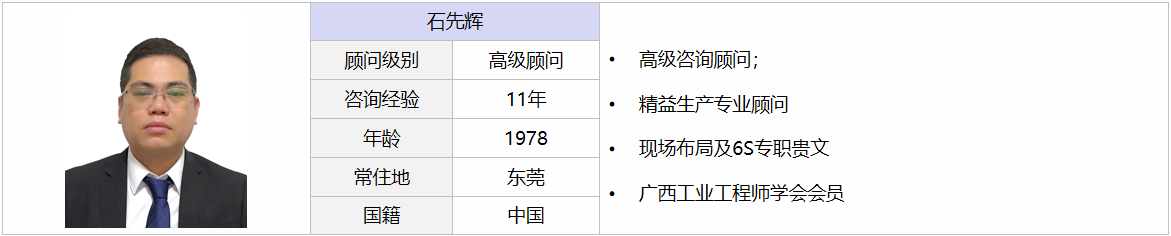 擅長業務:精益生產、成本控制、車間布局、IE改善、生產效率改善、品質提升、自動化設備革新、計件報工系統改善、績效考核、年度經營戰略、5S管理、目視化、六西格瑪、流程梳理等;
